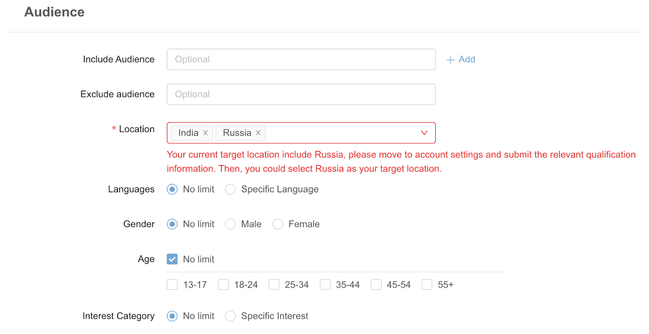 1. For ad accounts wihout submitting relevant info, when Russia is added to the target region of the ad group, the following blocking prompt will appear.