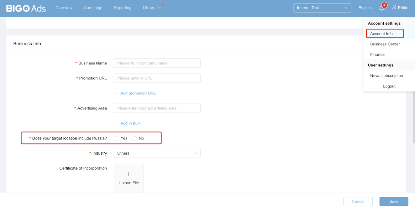 3. Advertisers can go to “Account Settings” - “Account Info” to fill in and edit account info.