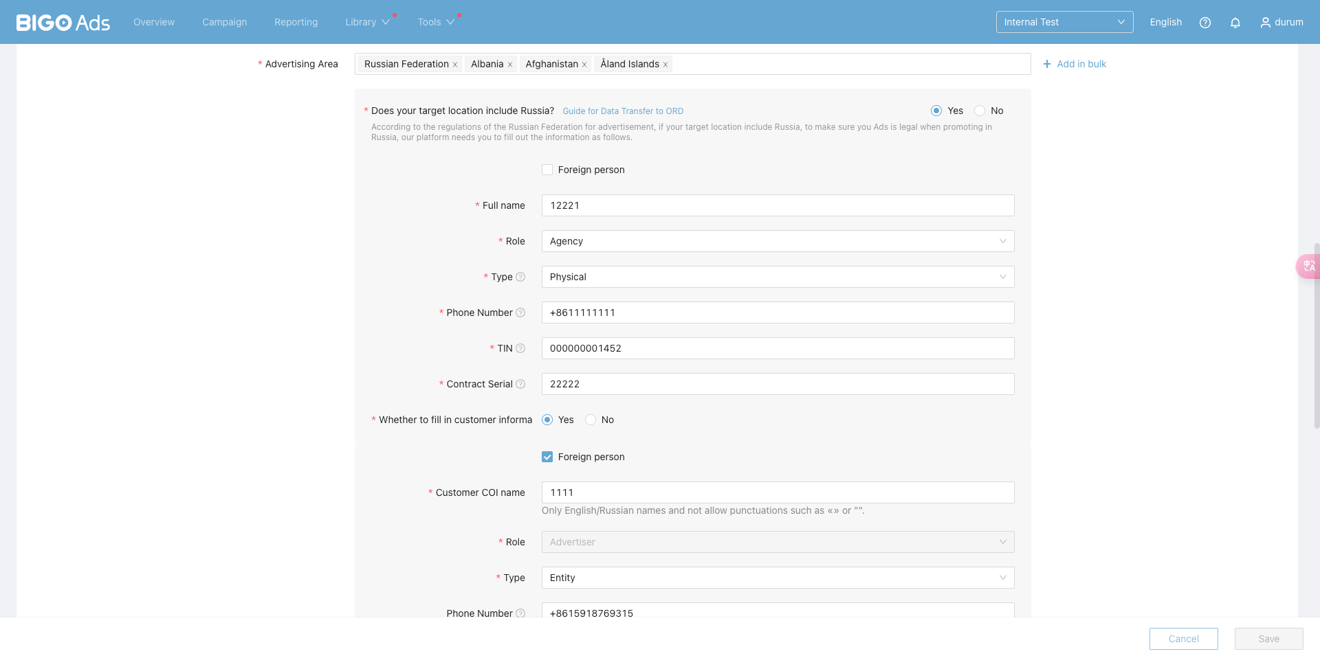 When creating a new ad account in the Business Center, it is a MUST to fill in the following blanks when your target GEOs contain Russia. Otherwise, you could not create any ad group.