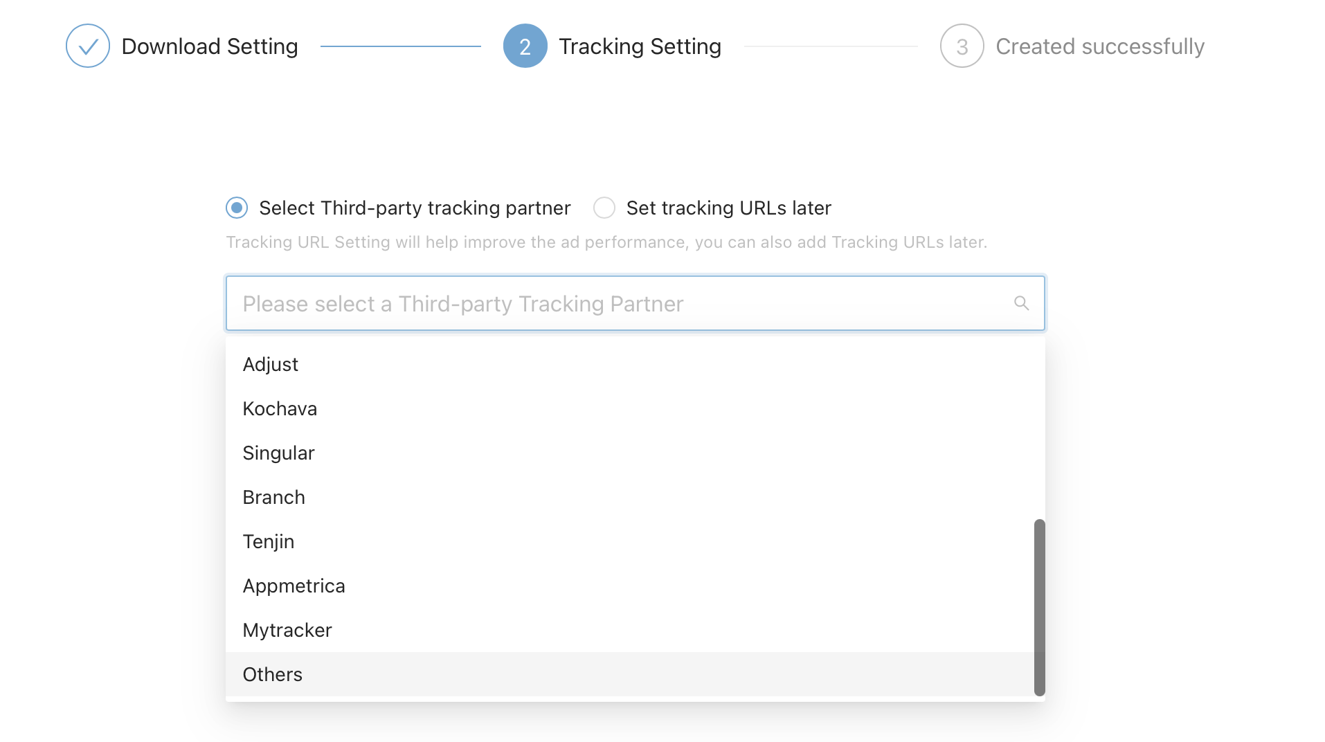 Choose your tracking platform per needs under third-party tracking partner->Set click url and impression url.