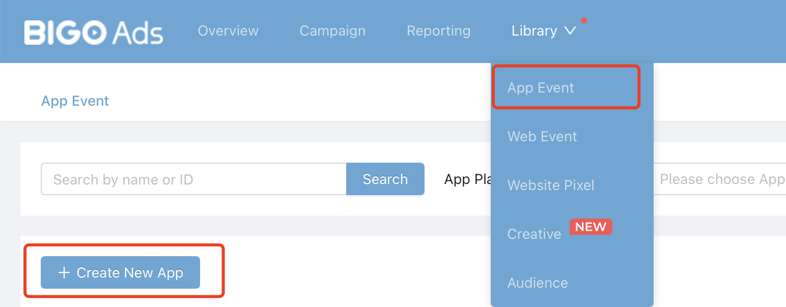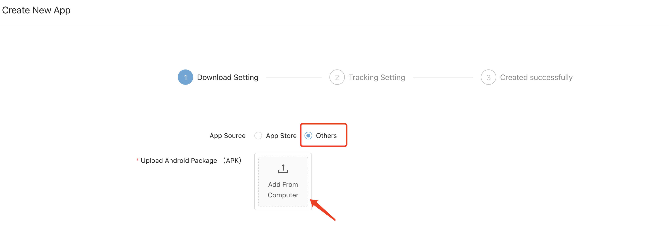 Path: Library->App Event->Create New APP-> Choose others for app source->Upload the apk package->Fill in basic information.