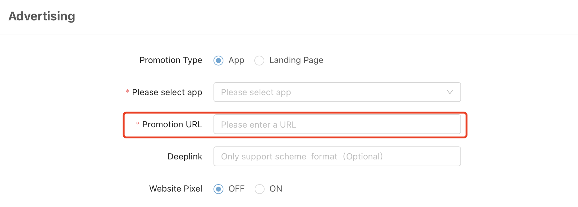 2.4.2 Choose your App at Ad group and fill in with your landing page.