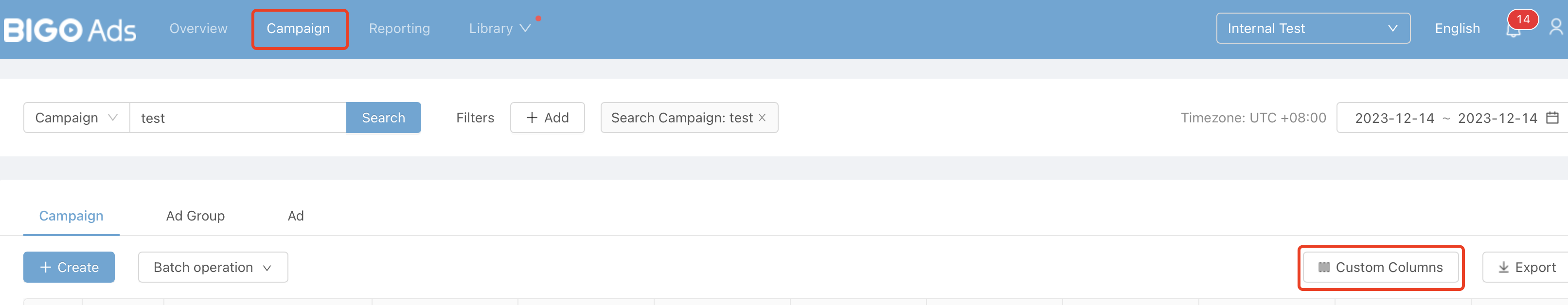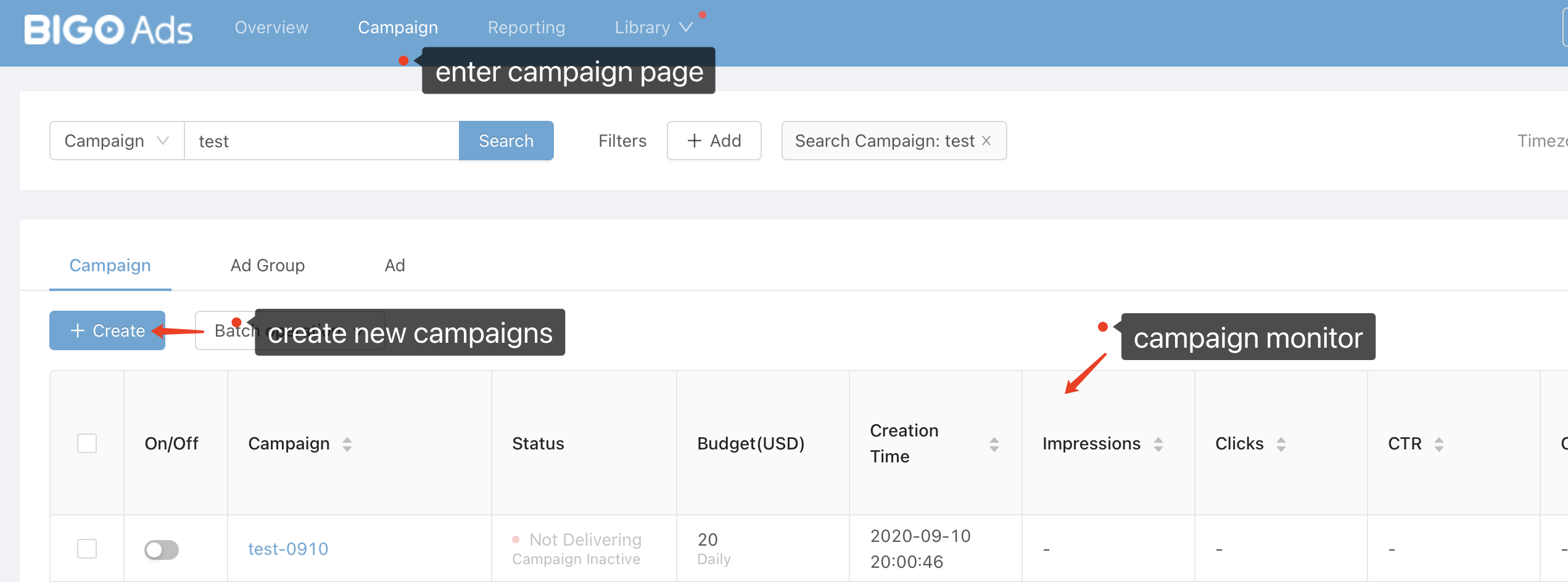 In [Campaign] page, you can create campaign, ad group and ad here, also monitor performance of all the existing ones.