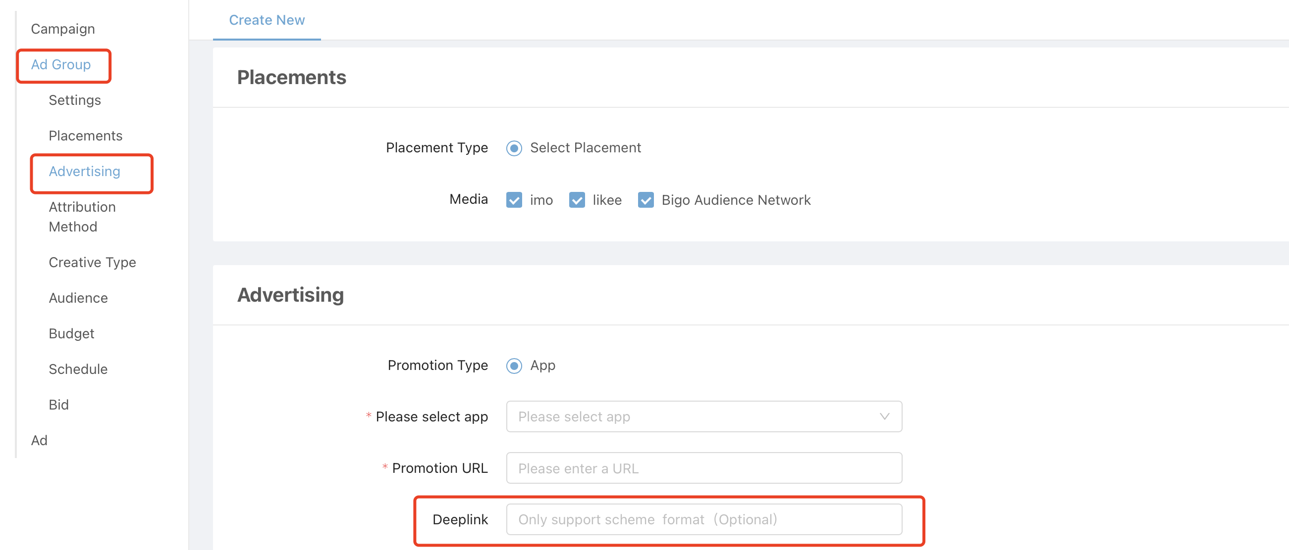 e. Create Ad group with promotion type as App, choose your app and fill in the deeplink.