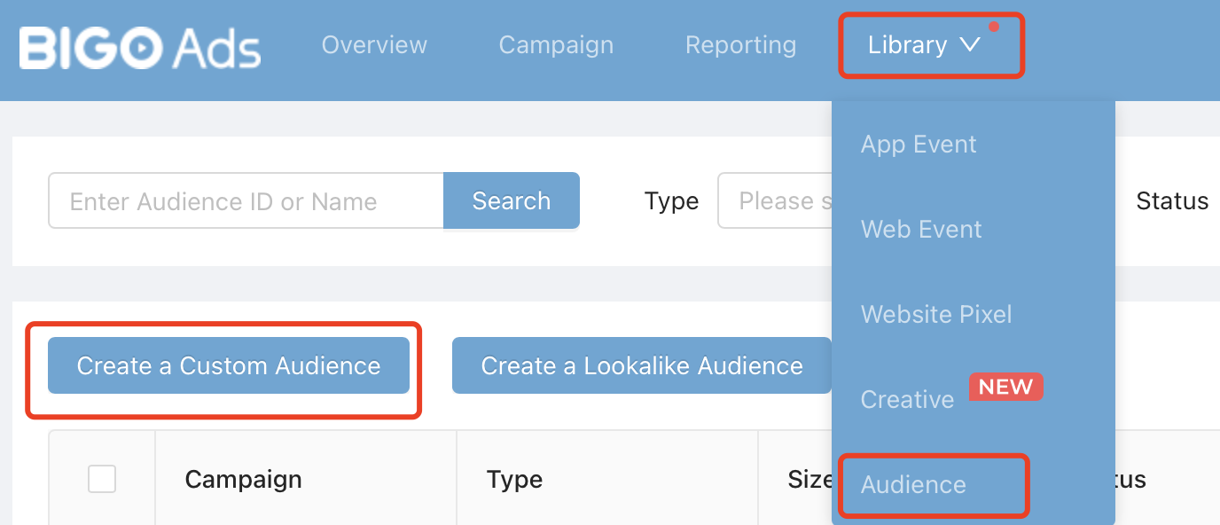 a. Upload GAID/IDFA List: Log in to you ad account and under [Library]-[Audience]-[Create a Custom Audience]-[Customer File].