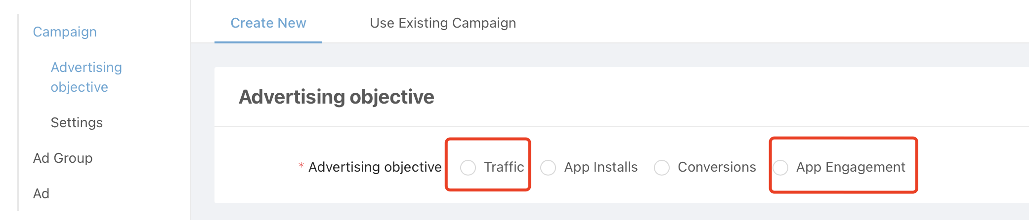 - Traffic: when you don’t have MMP tracking links set up in Step 3, then you should choose [Traffic], and only use CPC bidding mode.