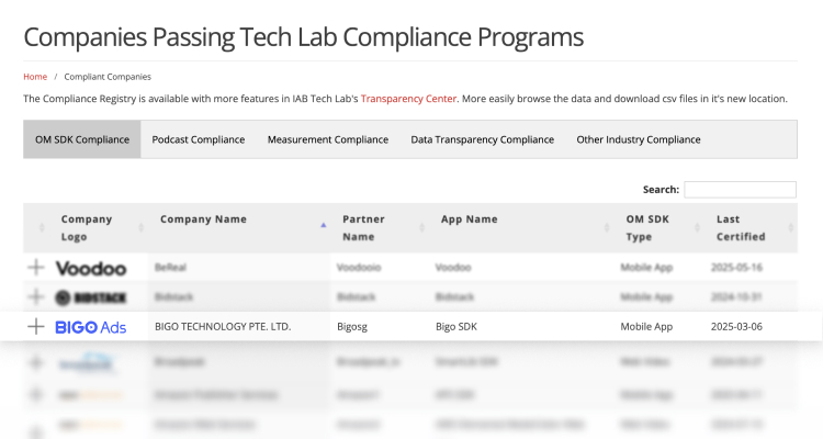 BIGO Ads has once again passed the compliance certification of the IAB Tech Lab Open Measurement SDK (OM SDK), making it one of the programmatic advertising platforms worldwide to maintain this certification for five consecutive years (2020–2025).